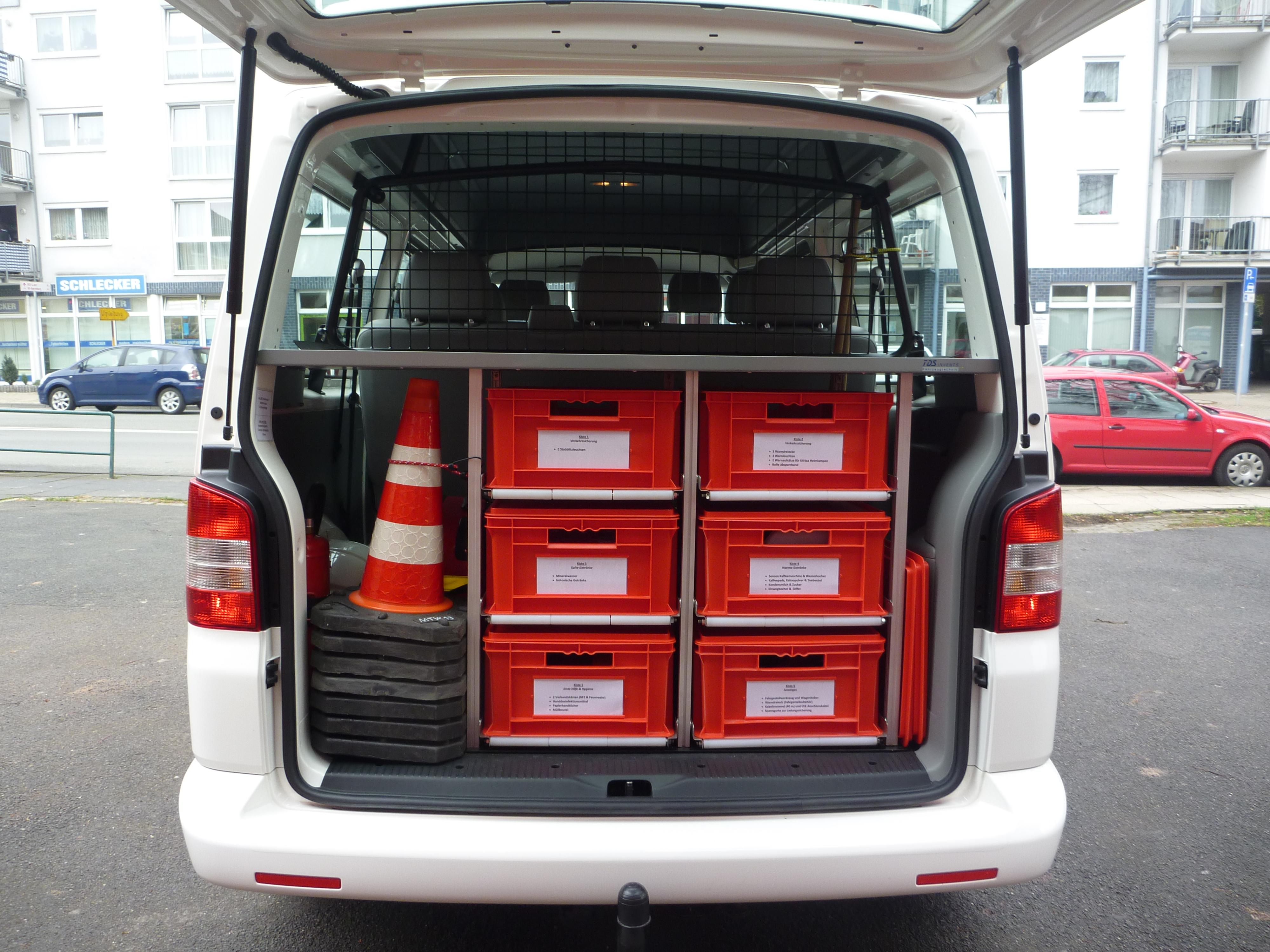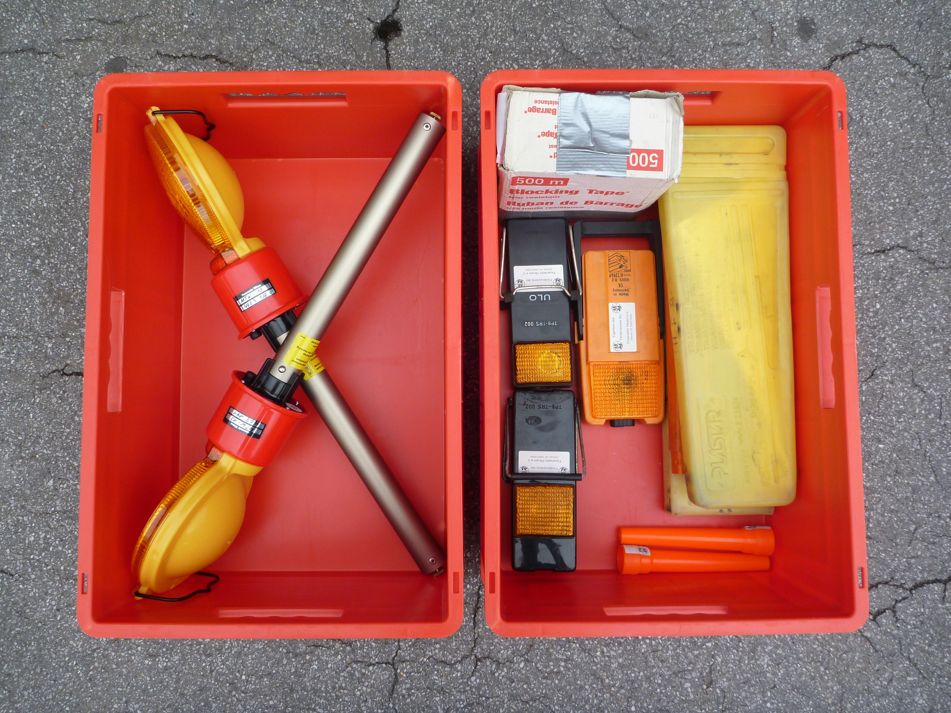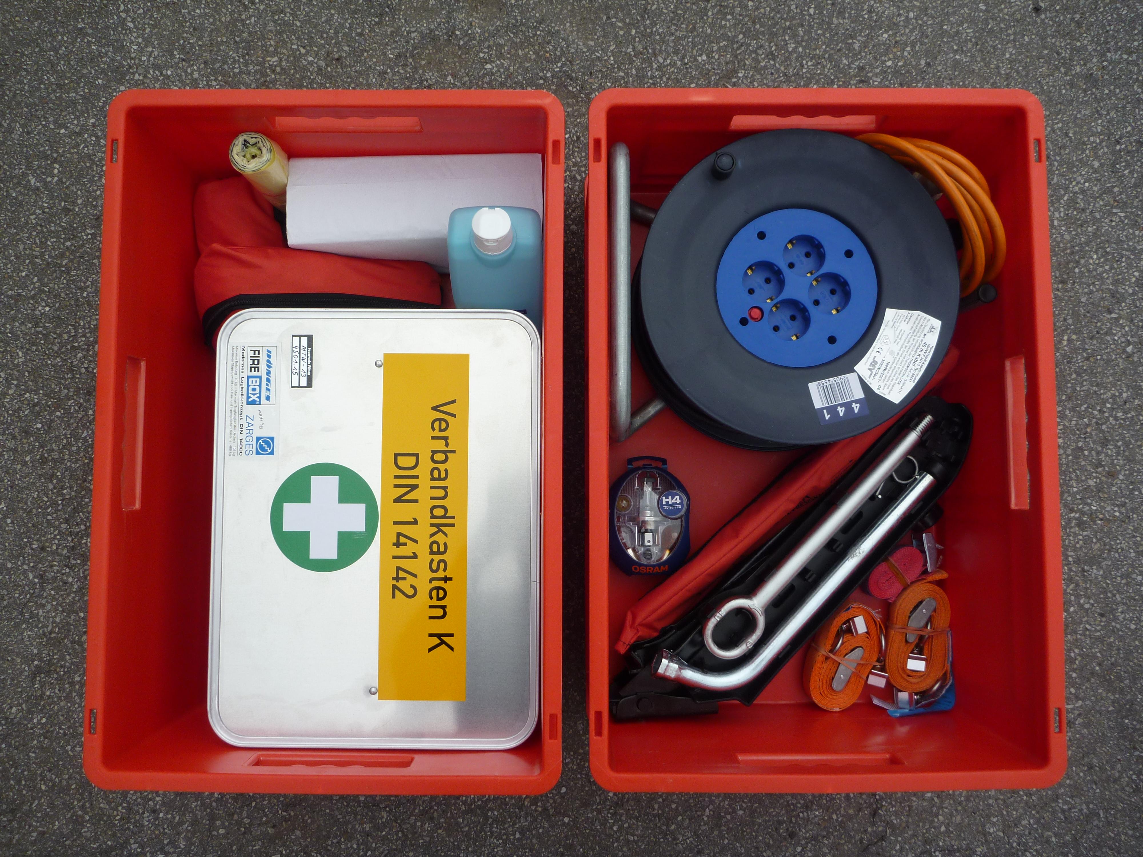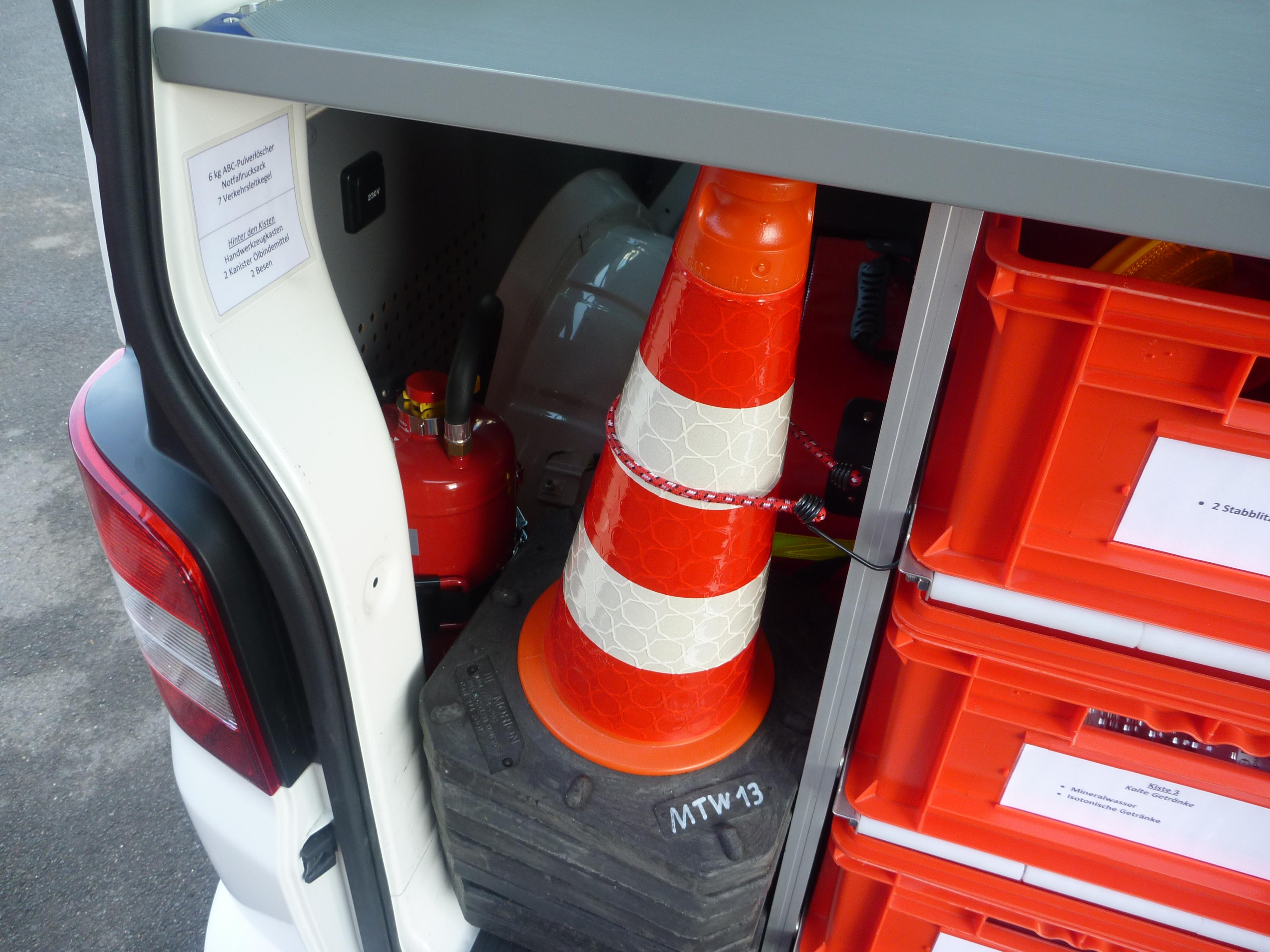 den Kisten 6 kg ABC-Pulverlöscher Notfallrucksack 7 Verkehrsleitkegel |
