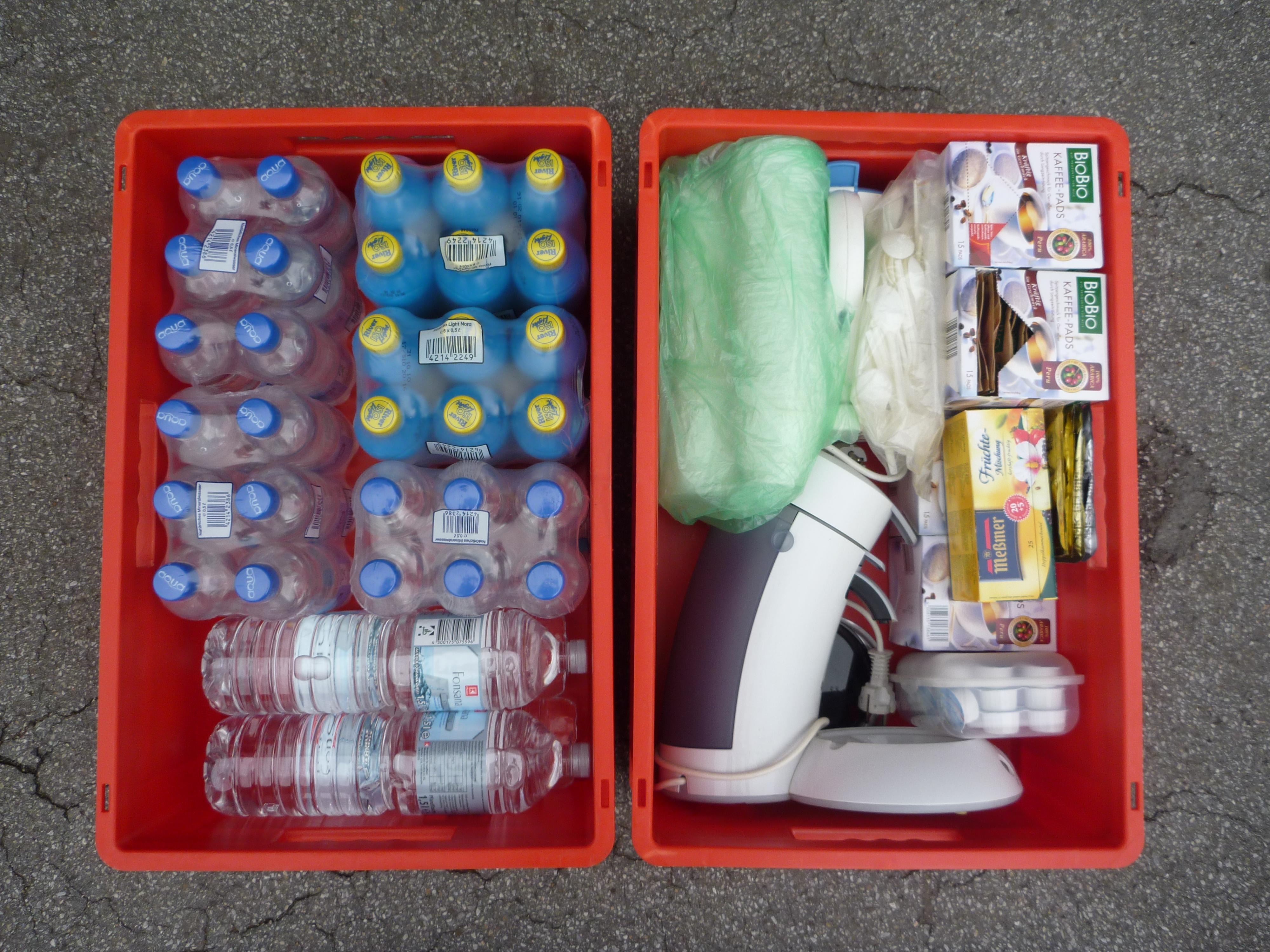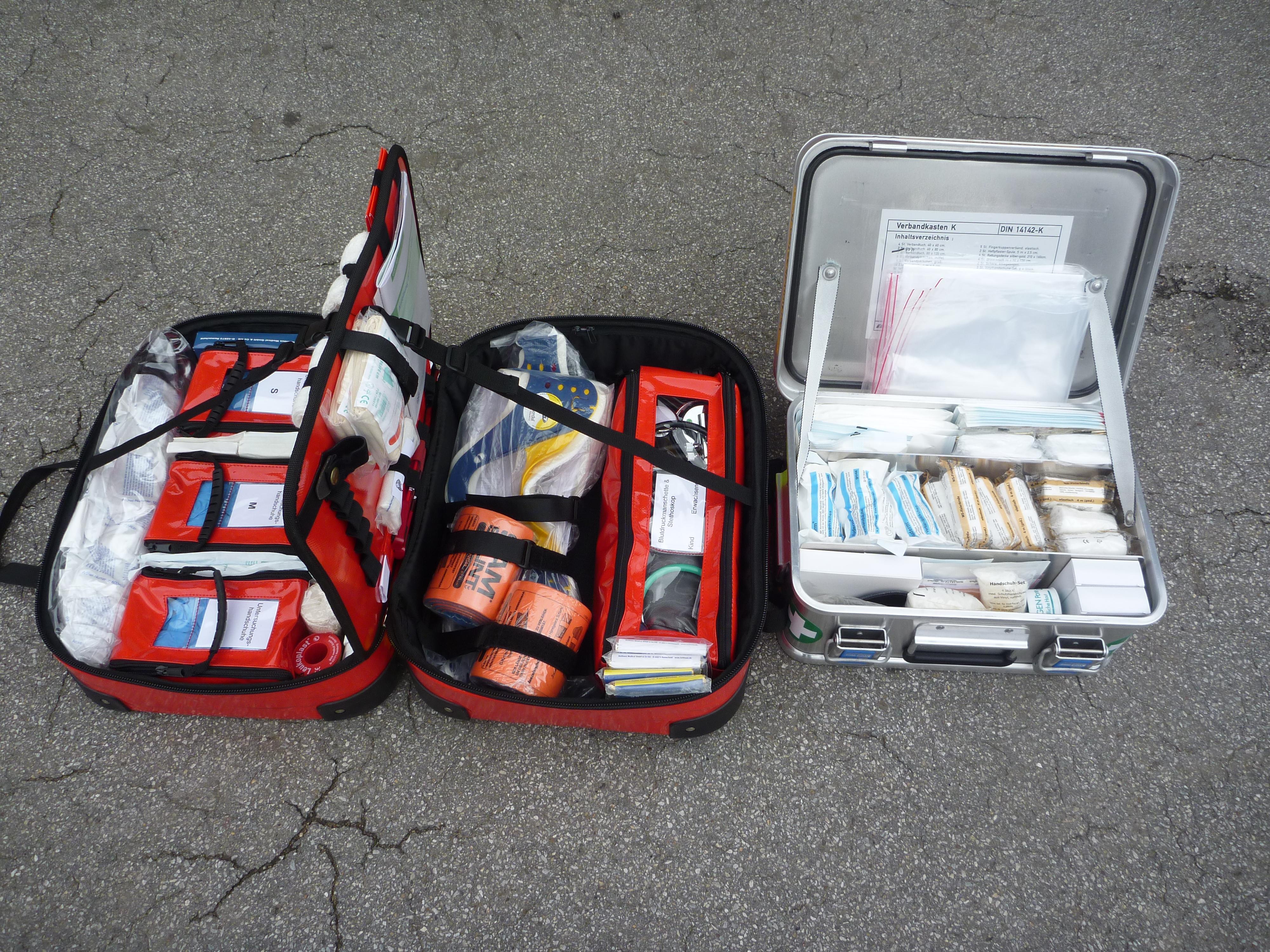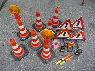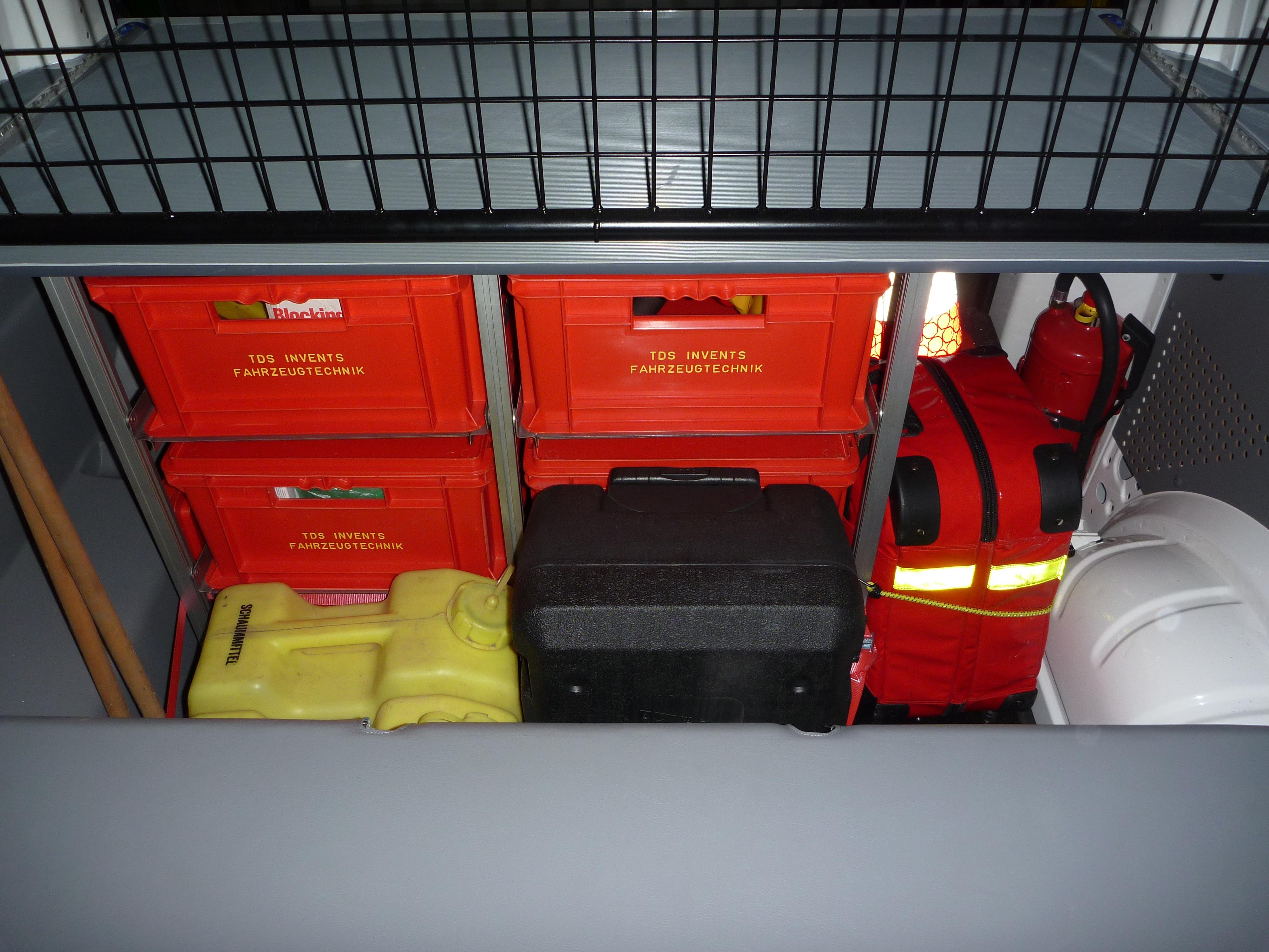 den Kisten 6 kg ABC-Pulverlöscher Notfallrucksack 7 Verkehrsleitkegel |